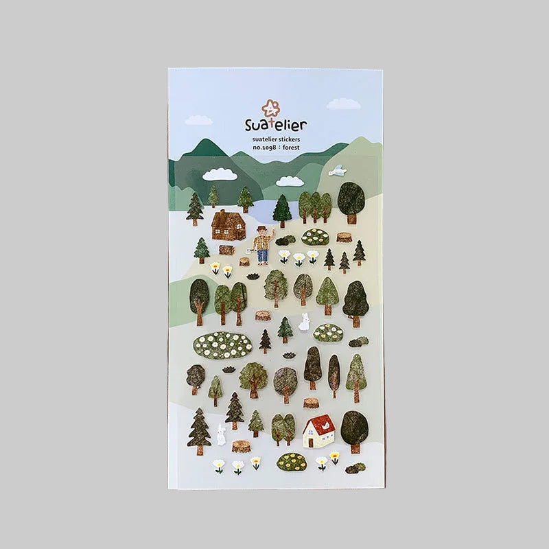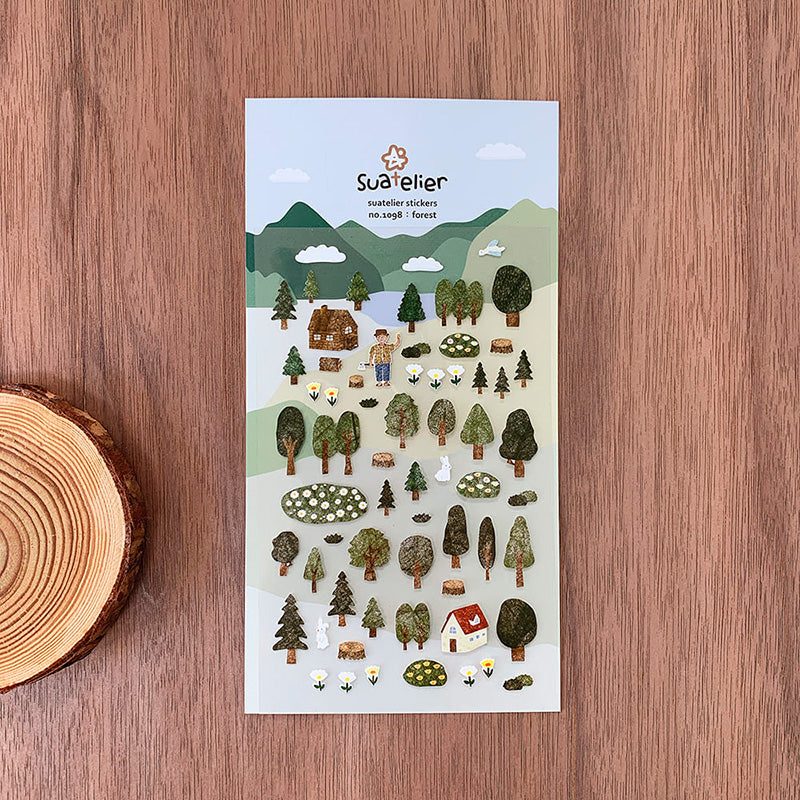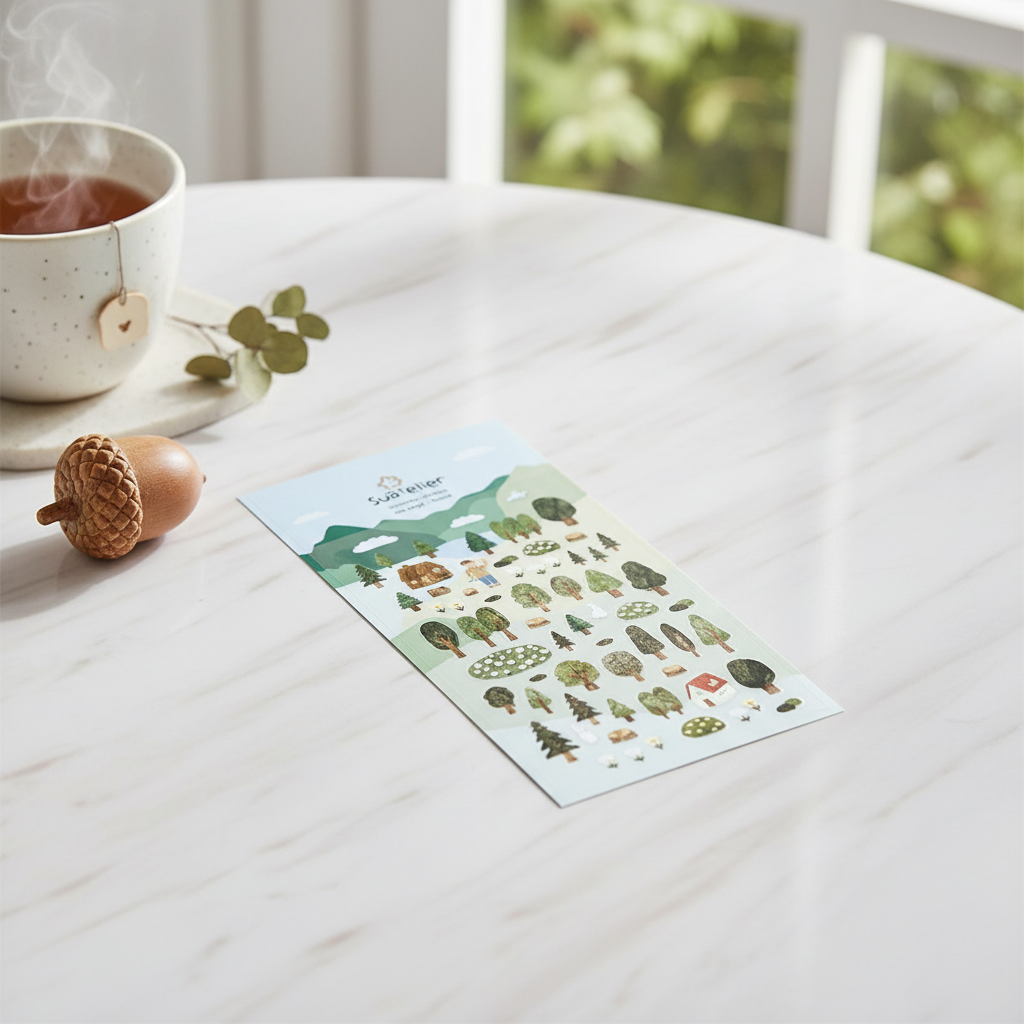 Set of decorative forest-themed stickers made from high-quality Korean paper. Ideal for personalizing planners, notebooks, and various smooth surfaces with colorful designs.