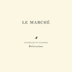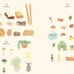 Ilustraciones detalladas de puestos de fruta, flores frescas y el ambiente vibrante de un mercado tradicional francés, complementadas con stickers decorativos.