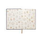 Cuaderno con cubierta rígida forrada en tela con acentos en dorado.