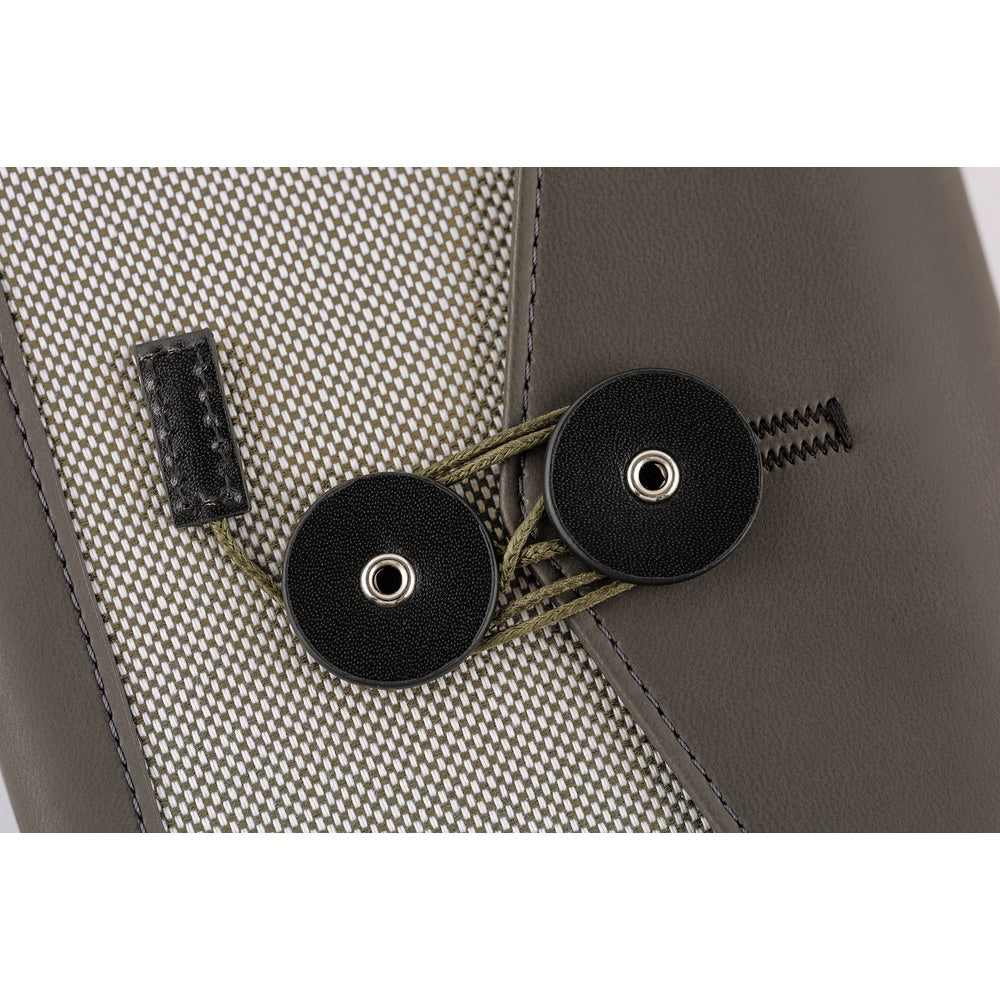 El botón redondo y los extremos del cordón están fabricados en piel auténtica. El cordón, en tono verde caqui, puede enrollarse de forma sencilla o cruzada, añadiendo un gesto estético al acto de abrir y cerrar.