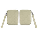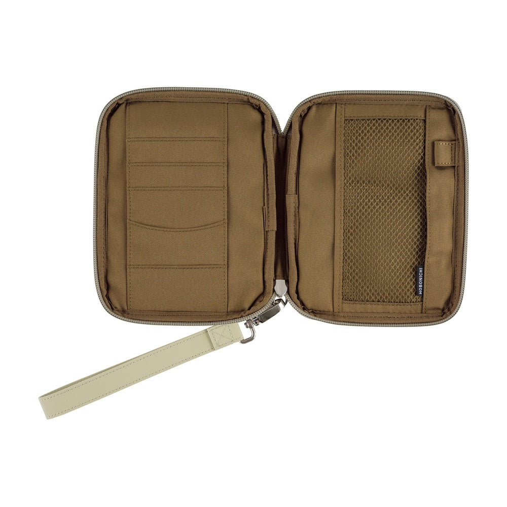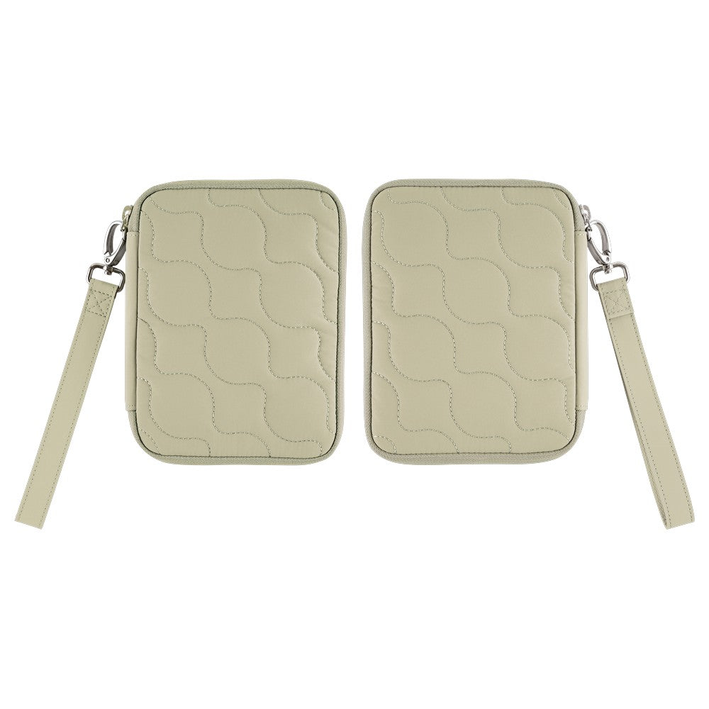 Su color verde salvia suave transmite calma y sencillez, mientras que la textura mullida y el acolchado la hacen especialmente agradable al tacto. Puedes usarla como una pequeña pouch: cabe perfectamente tu Hobonichi junto con otro cuaderno más grueso, y gracias a la correa larga, puedes llevarla cómodamente en la muñeca cuando estás en movimiento.
