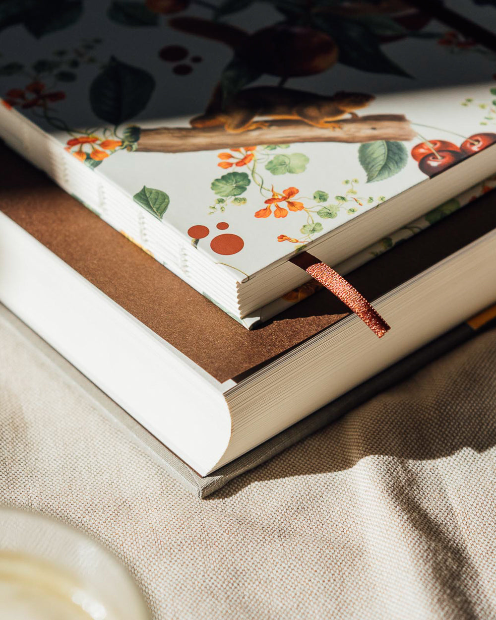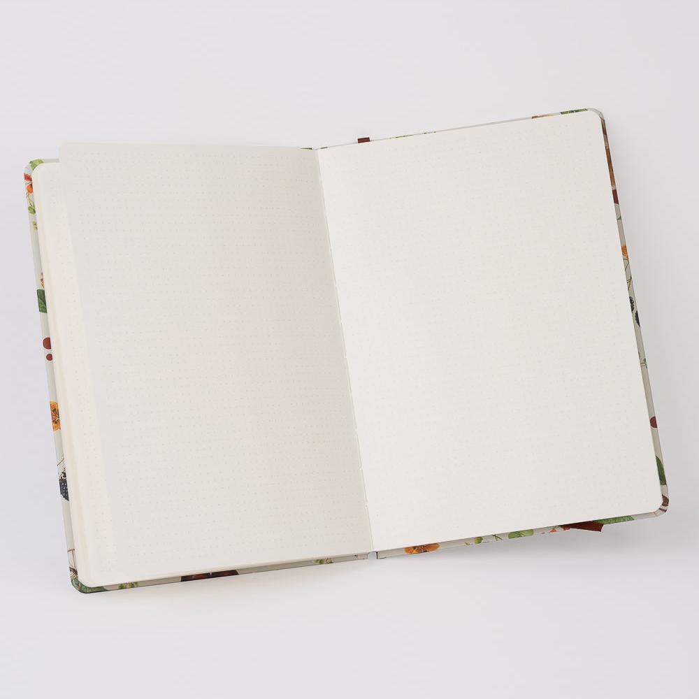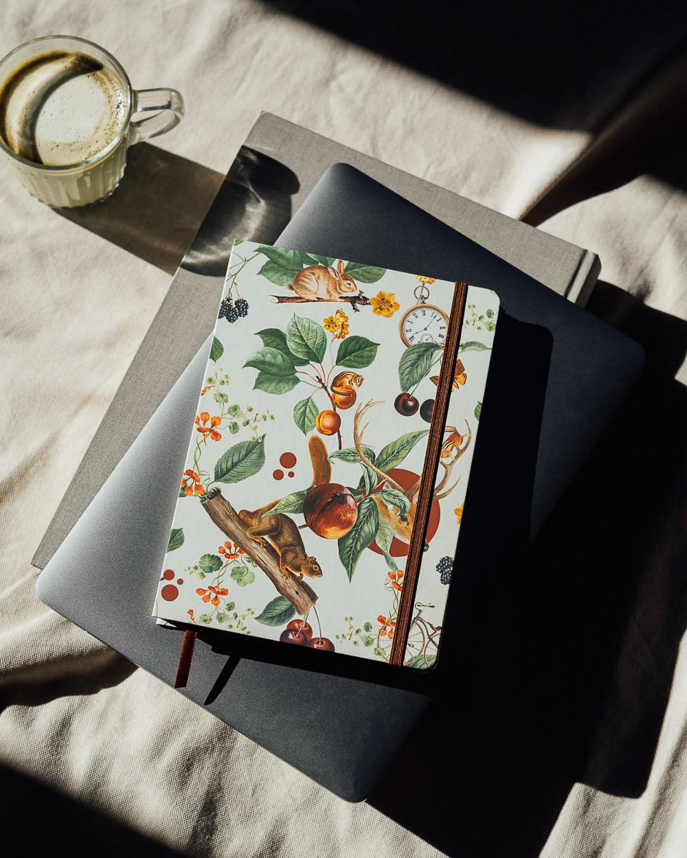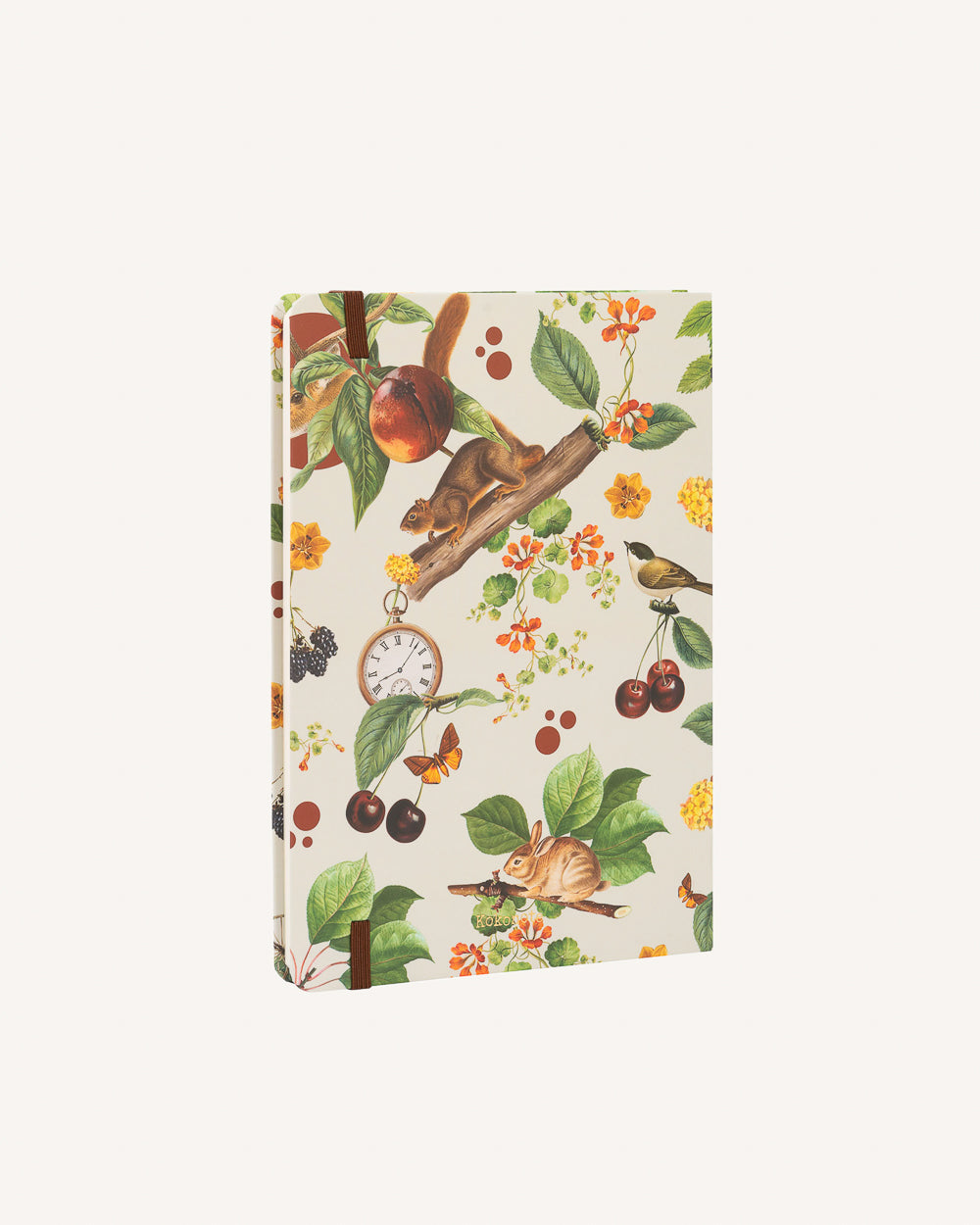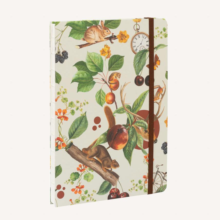 Cuaderno A5 con tapa dura con una bonita ilustración inspirada en la naturaleza y detalles vintage, es una joya para los amantes del arte y la escritura. Su cubierta dura está decorada con ilustraciones detalladas de animales, frutas y elementos botánicos que evocan un ambiente bucólico lleno de serenidad.