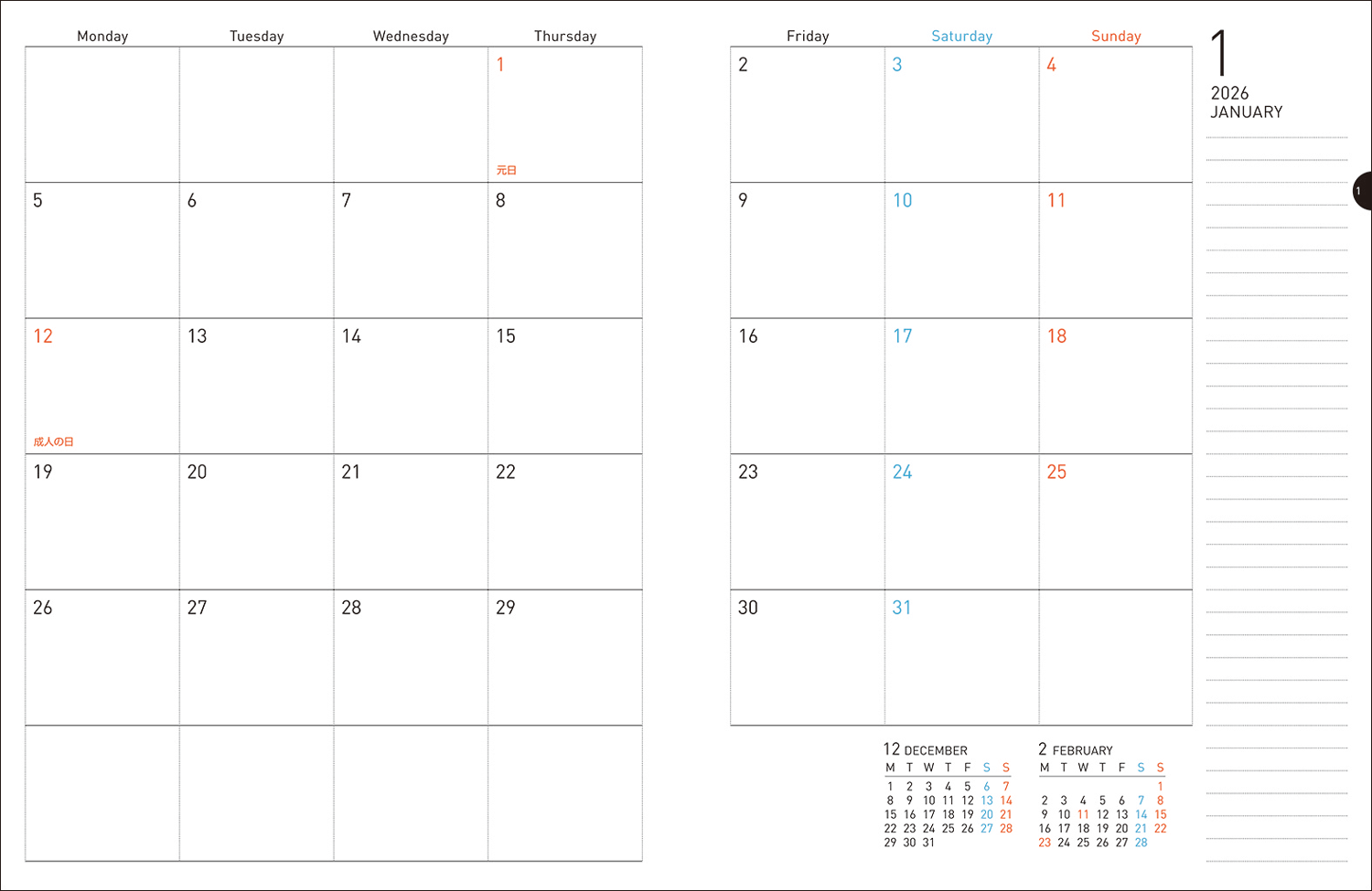 Agenda mensual 2026 con encuadernación Softring y páginas de notas cuadriculadas. Ligera, funcional y perfecta para tu día a día.