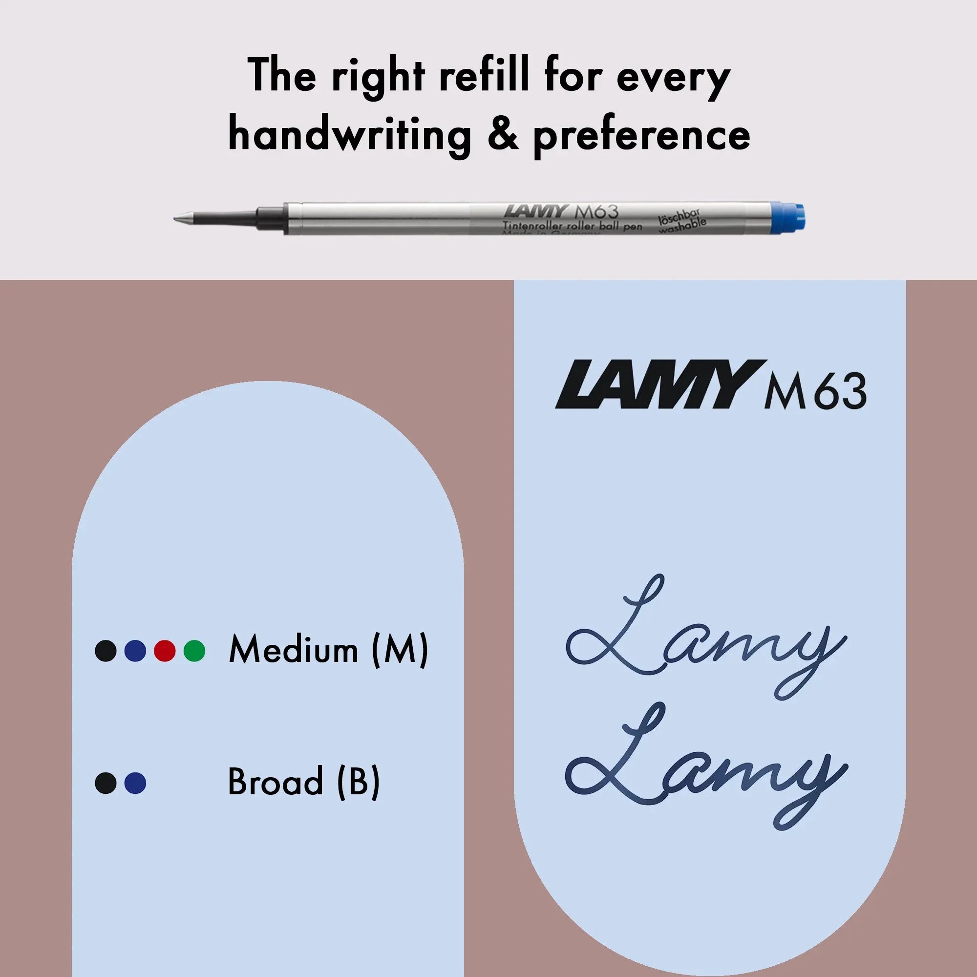 Este roller incluye un recambio LAMY M 63 en negro con trazo M, y puede recargarse fácilmente para acompañarte por mucho tiempo.