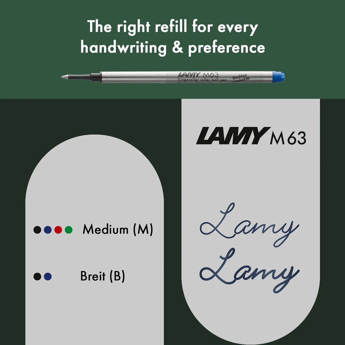 Este roller incluye un recambio LAMY M 63 en negro con trazo M, y puede recargarse fácilmente para acompañarte por mucho tiempo.
