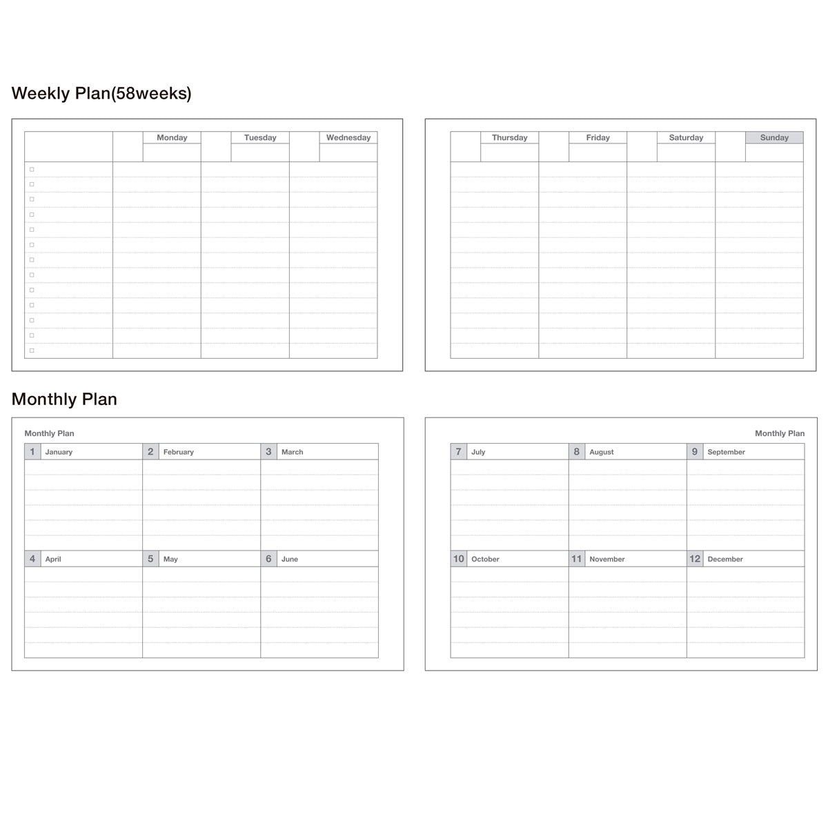 Planificador semanal perpetuo con anillas y tapa de cartón flexible. Tiene 58 semanas y también incluye plan mensual.