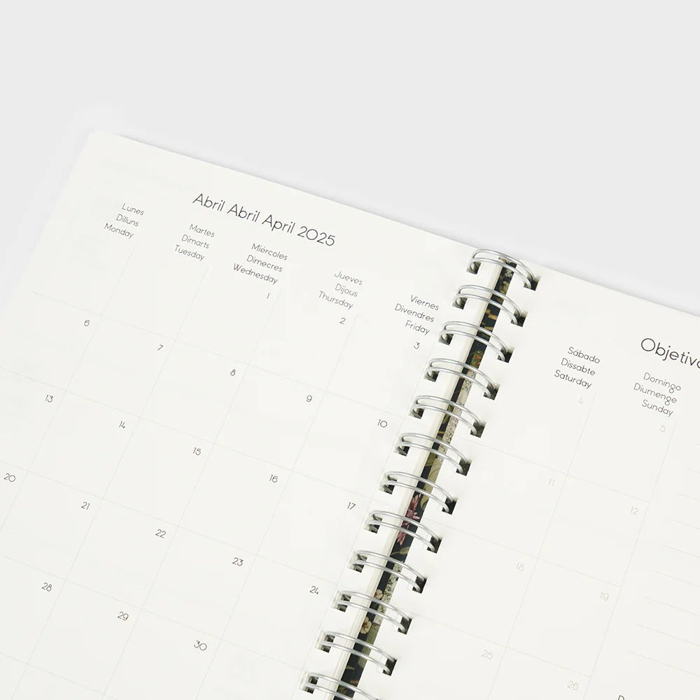 La tapa de la agenda está forrada en papel estampado, tiene un grabado en relieve “2026” y se cierra con goma.